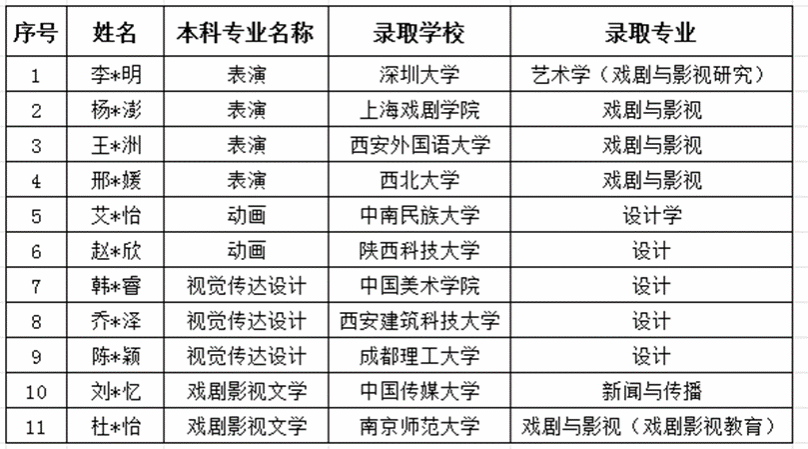 等高校的相关艺术类专业,其中不乏“双一流”高校和高水平艺术类院校,攻读方向包括艺术学、设计学、新闻与传播、戏剧与影视学等多个领域,实现了在学术深造道路上的高质量跨越。