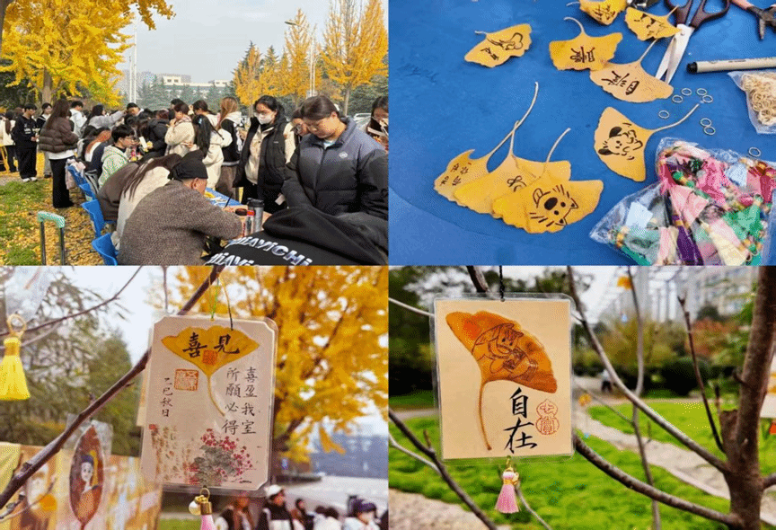 共同搭建的手工作坊里,美育与心育悄然融合。师生们挑选叶脉,提笔写下心语,让情感在叶尖流转。这一笔一画的过程,是专注的冥想,是情感的倾诉。当“前程似锦”与“岁月无忧”在叶间互答,银杏叶便成了传递情谊与温暖的使者。这片独属自己的岁月书签,既是秋日的缩影,也是一次有效的艺术疗愈,守护着每位师生心中那份纯粹的温暖。