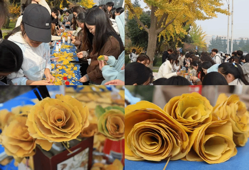 秋意正浓时,银杏叶不再是飘零的叹息,而成了指尖跃动的精灵。志愿者与同学们一起轻执叶片,以巧手为引,将自然的馈赠化作一场魔法盛宴——渐变的黄叶被卷成绽放的“玫瑰”,斑驳的褐叶舒展成翩跹的“蝴蝶”,连叶脉的褶皱都成了艺术的语言。而这些都是对“劳动创造美”的生动诠释。 愿我们永远保有发现美的眼睛与创造美的勇气,让每个季节的馈赠,都能在指尖绽放成永恒。