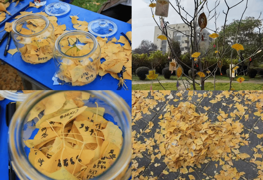 深秋时节,银杏果褪去青涩,裹着琥珀色的外壳坠落枝头,仿佛大地寄来的金色信笺。这些浑圆的果实不只是季节的馈赠,更是传递温情的使者——师生们俯身拾起一颗颗白果与写下带着期许与美好的寄语叶片一同装入罐中,让秋日的善意随果实与寄语流转,温暖远方的角落。