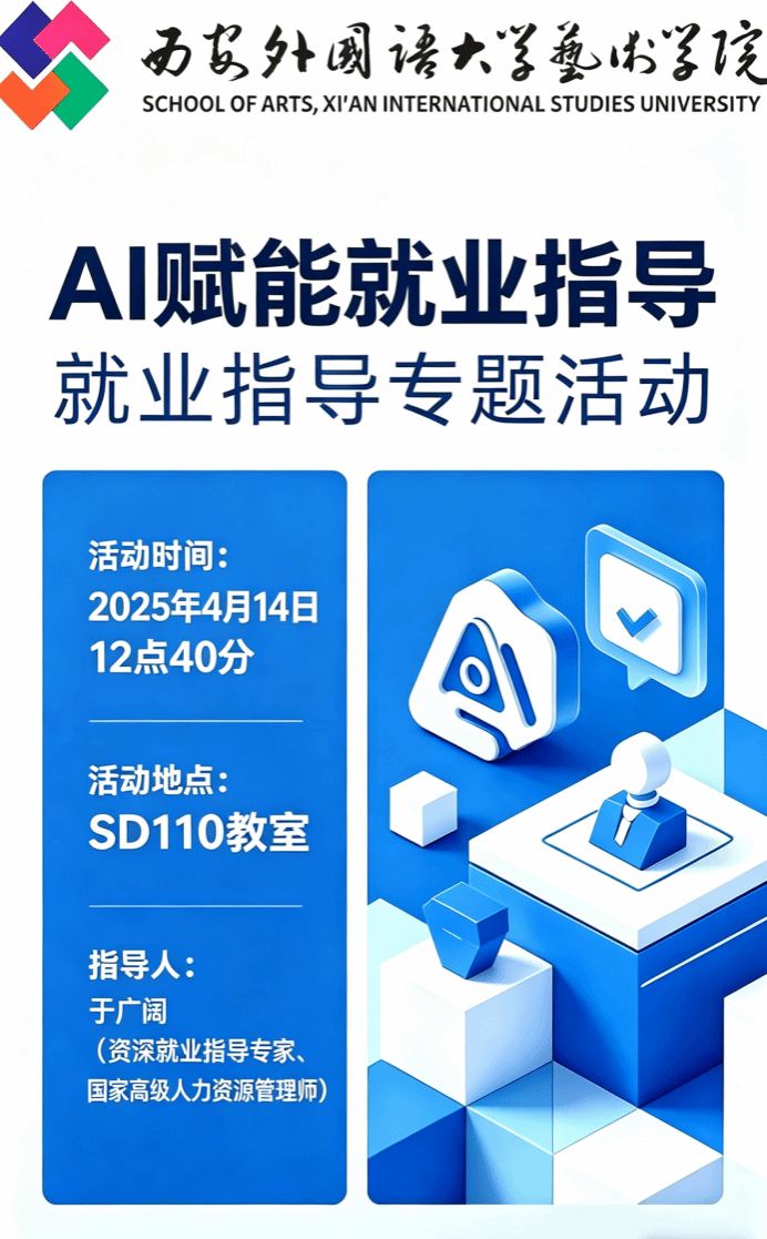 于4月14日下午在SD110举办“AI赋能就业指导”主题活动,本次活动特邀西安市人才中心就业指导讲师、国家高级人力资源管理师于广阔担任主讲,聚焦AI技术在学业与就业中的实战应用。莲湖区人社局人才交流中心就业指导部部长刘翔、av影片直播